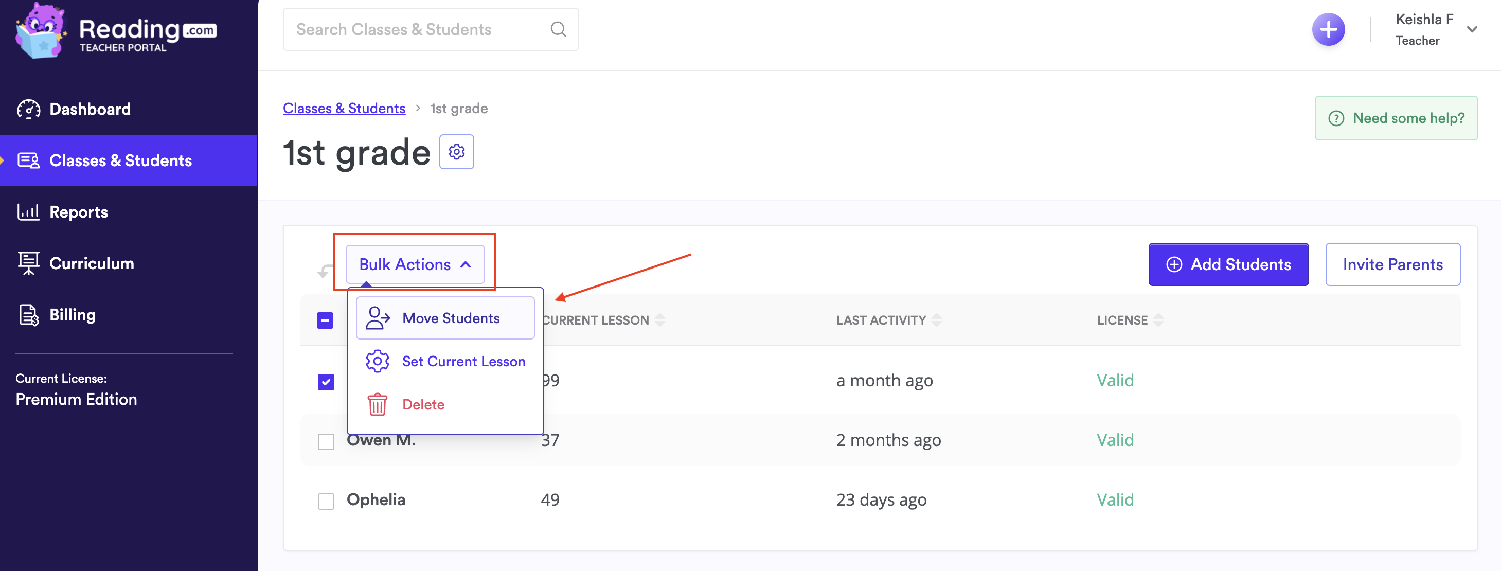 Step 4: Within the selected class, you can choose individual students or multiple students to move. Check the white checkbox to the left of each student's "First Name." To select all students, check the box to the left of "Student" below the "Bulk Actions" button.