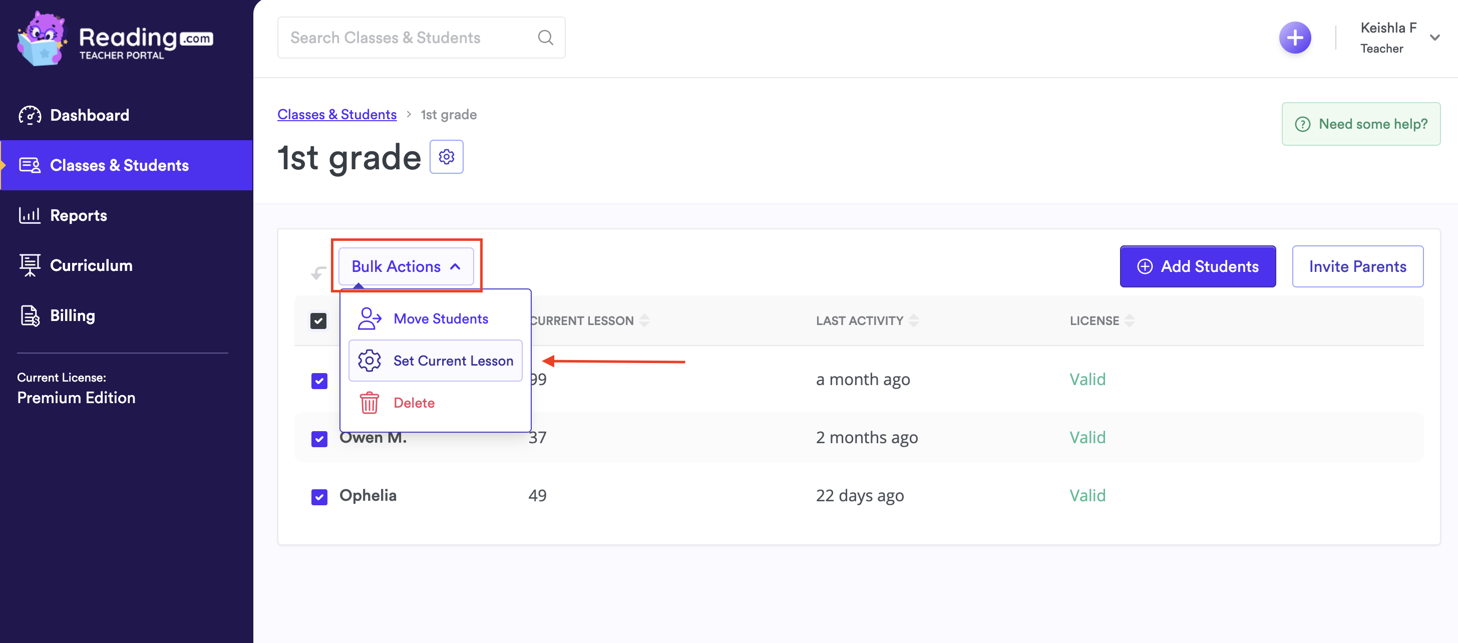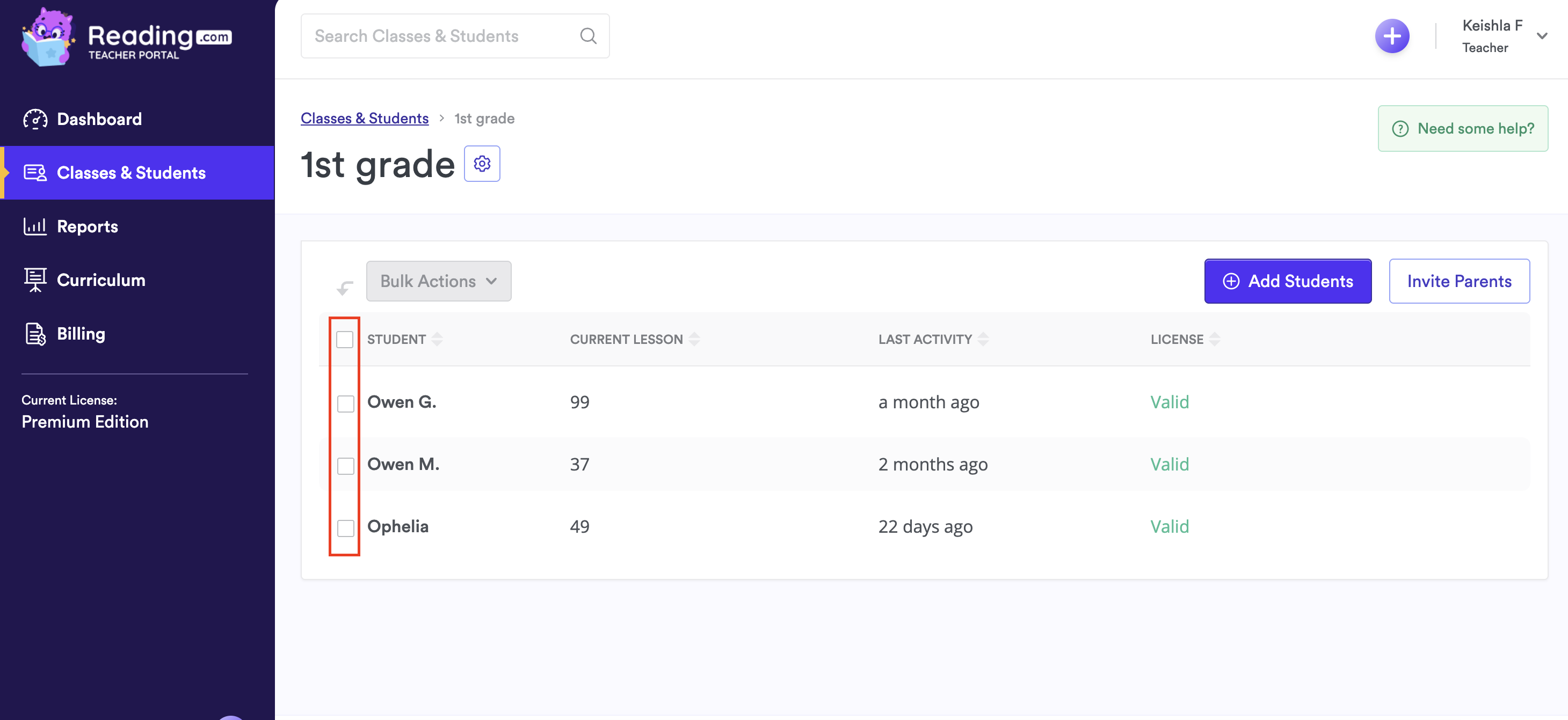 Step 4: Within the selected class, you can choose individual students or multiple students to set their current lesson. Check the white checkbox to the left of each student's "First Name." To select all students, check the box to the left of "Student" below the "Bulk Actions" button.