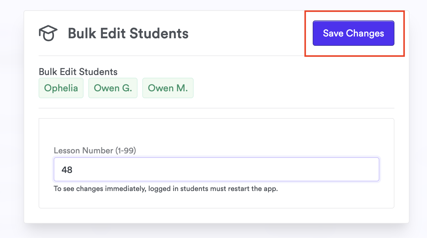 Step 6: In the pop-up box that appears, type in the lesson number you would like the student(s) to be set at. Double-check the lesson number for accuracy. After entering the lesson number, click "Save All Changes" to finalize the setting of the student's current lesson.