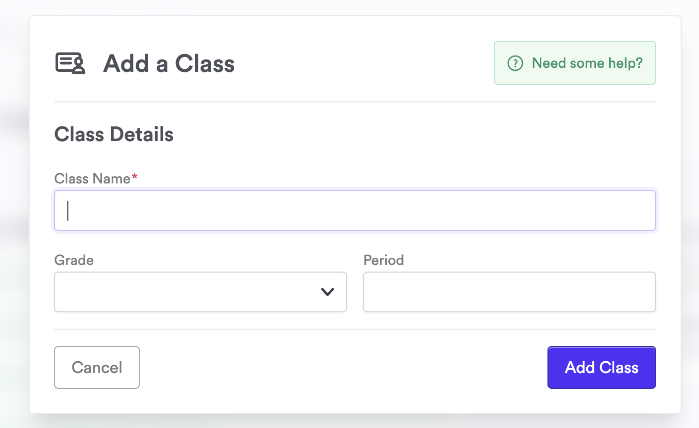 From your checklist or dashboard, click Add Class and enter your class details (name, grade, and period).
