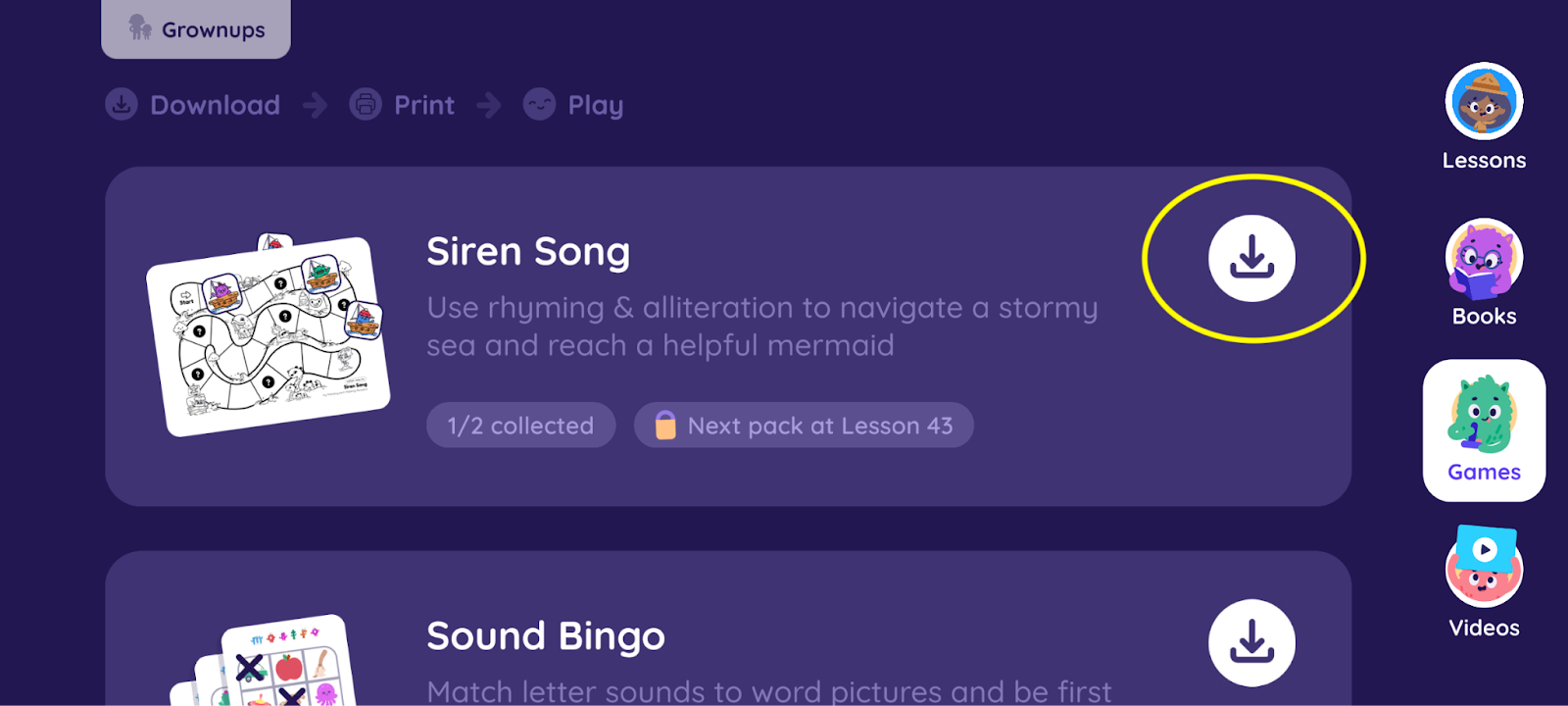 Games will appear first, and you can scroll down to find the first printable activity, "Siren Song." To download the printable activity, tap the download button provided.
