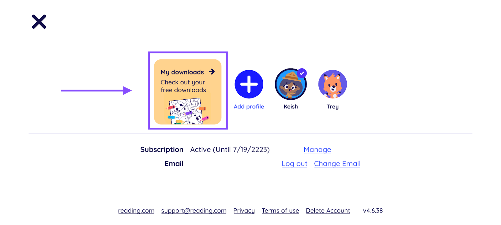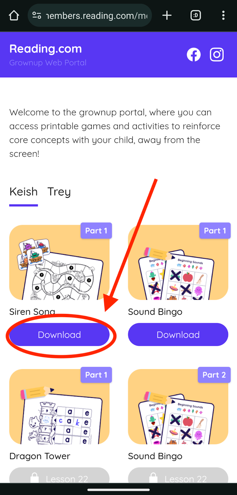 You'll be directed to the grownup portal, which opens in a web browser. Here, you'll find your children's profiles and the activities they have unlocked. Simply select your child's profile and tap the purple "Download" button to access the printable activity. Please note that if the button appears gray with a padlock symbol, it means your child hasn't completed the required lesson to access that particular activity.
