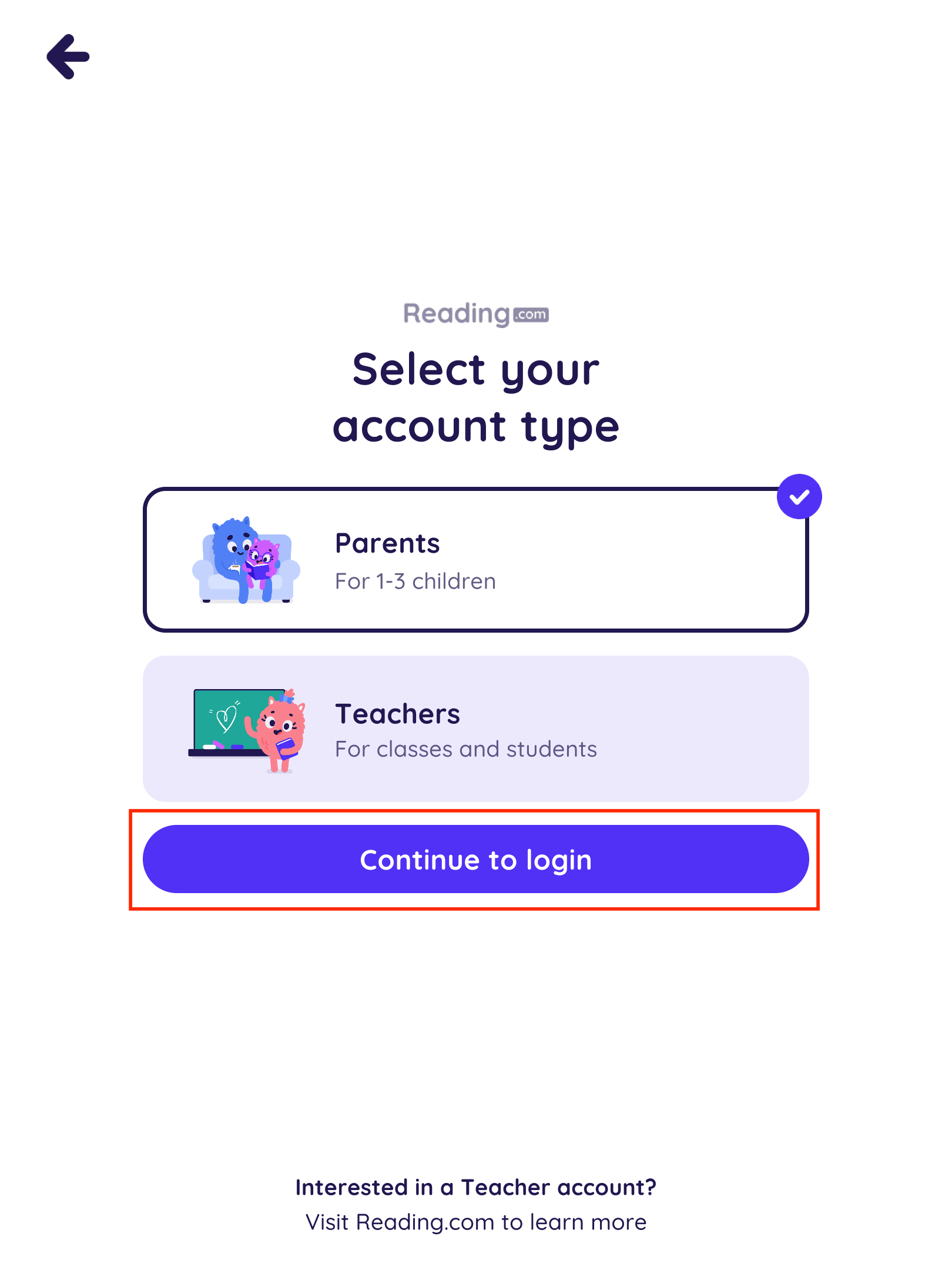 After the initial screens, you'll see an option that says, 'Select Your Account Type.' Choose your type of account—Teachers or Parents—and then tap Continue to log in.